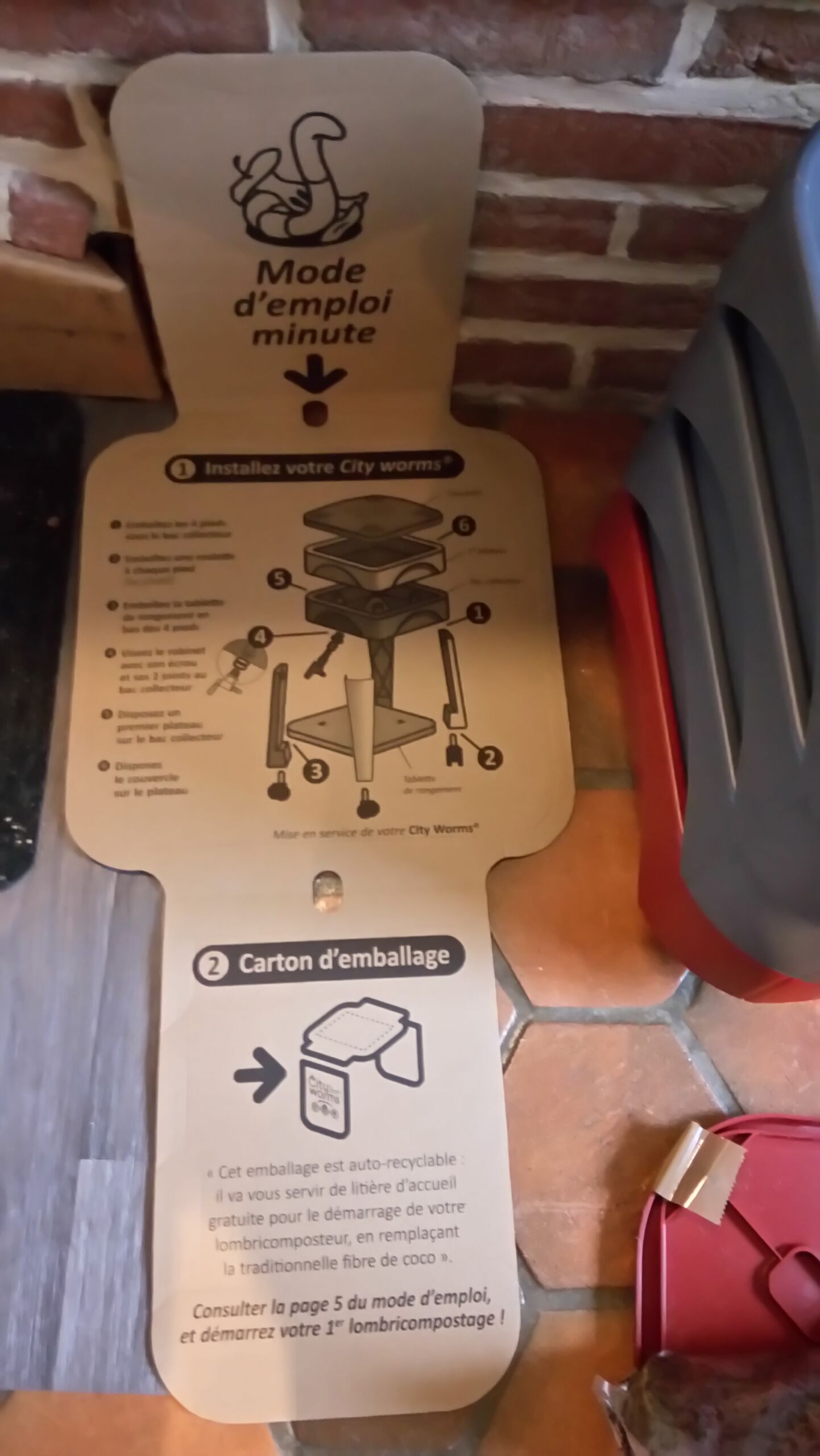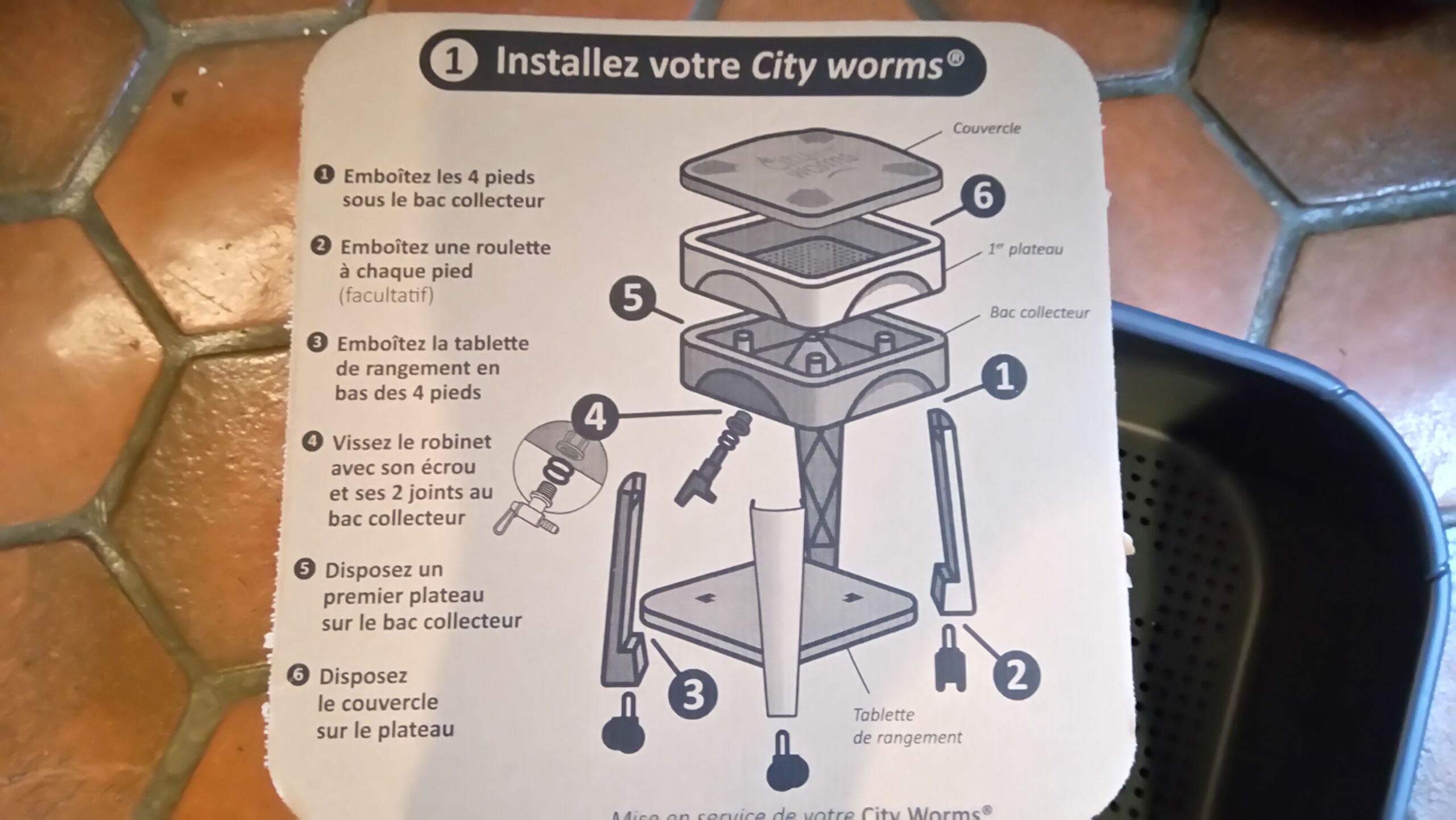 – Montage facile. La notice est sommaire mais permet de comprendre facilement la façon d’assembler la structure. Sur les pieds se fixeront d’une part la tablette et le bac récepteur. Pour les plateaux, il suffit de les empiler les uns aux autres, en fonction des apports organiques ! Une vidéo complète cette notice. Découvrez quelques photos plus bas 😉
